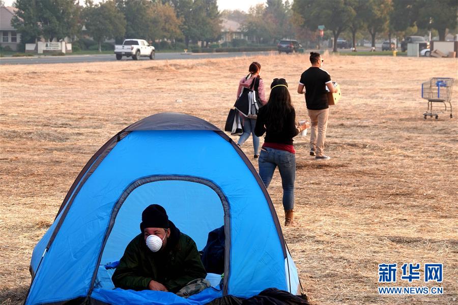 11月18日,在美国加利福尼亚州比尤特县奇科,灾民在沃尔玛停车场搭起帐篷暂居。  新华社记者吴晓凌摄