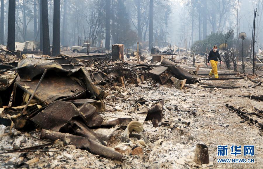 11月13日,在美国加利福尼亚州天堂镇,搜救人员在山火过后的废墟工作。