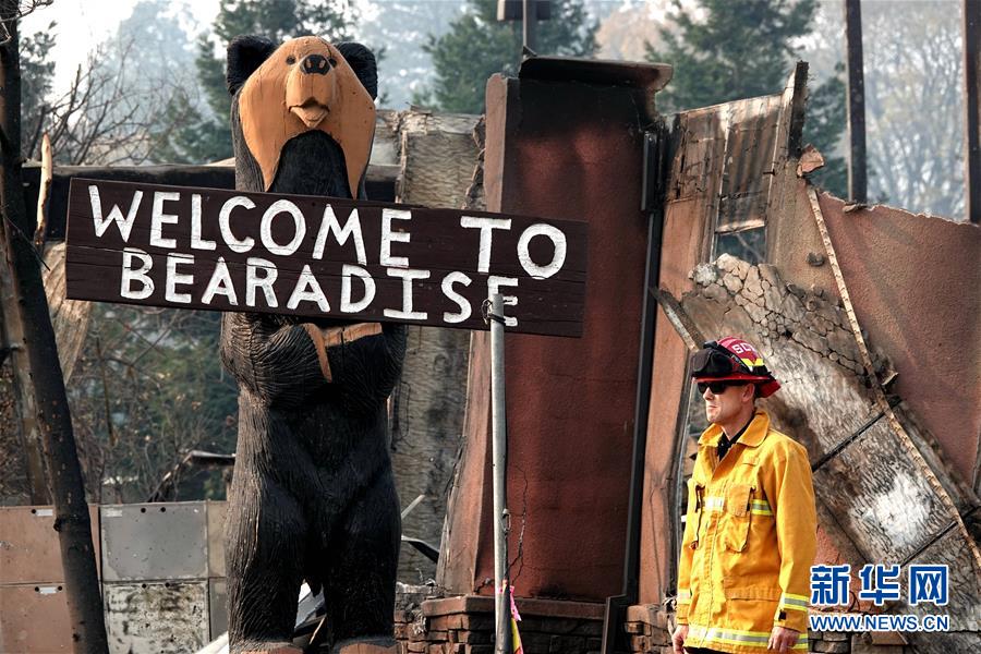 11月18日,在美国加利福尼亚州比尤特县天堂镇,一名消防人员站在废墟旁。 新华社记者吴晓凌摄