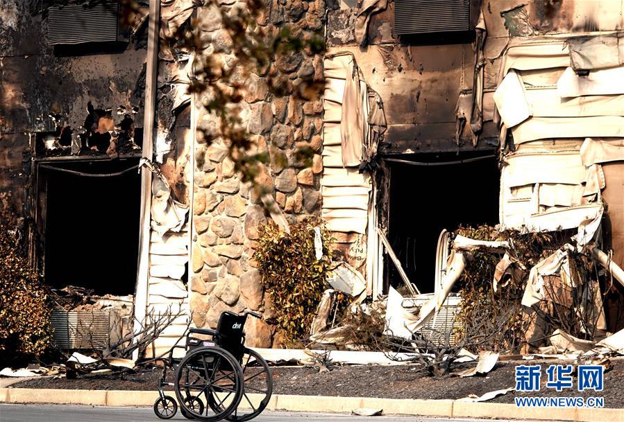 11月18日,在美国加利福尼亚州比尤特县天堂镇,一个轮椅被弃置在一幢遭焚毁的住所旁。 新华社记者吴晓凌摄