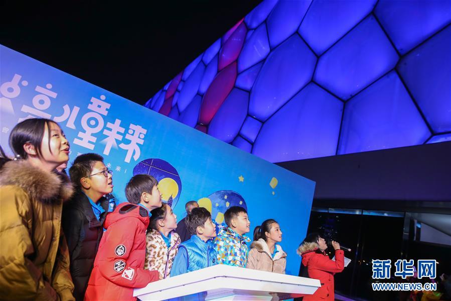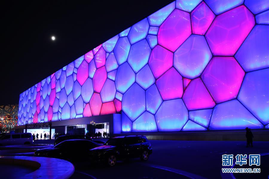 11月20日,在北京举行的世界儿童日主题活动上,国家游泳中心外墙被点亮。 新华社记者张玉薇摄
