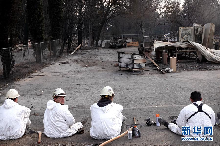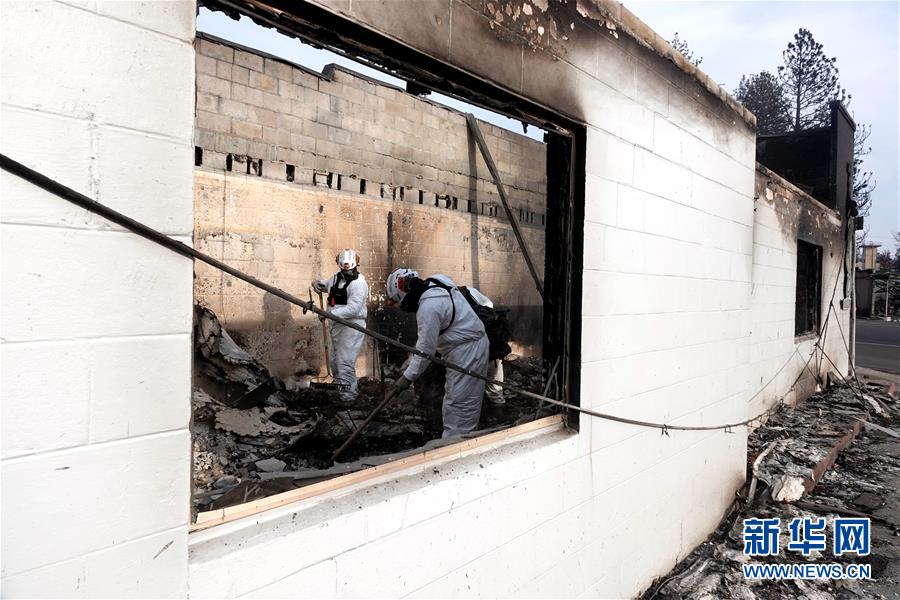 11月20日,在美国加利福尼亚州比尤特县天堂镇,救援人员在灾区工作。