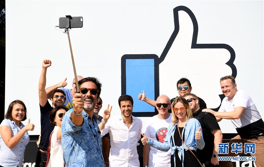 8月11日,在美国旧金山湾区,参加“脸书节”的游客在脸书园区标志前合影。当日,旧金山湾区脸书园区举行“脸书节”,人们在活动中欣赏文艺表演,品尝美食,乘坐游乐设施等,活动收入将捐给慈善团体。新华社记者吴晓凌摄