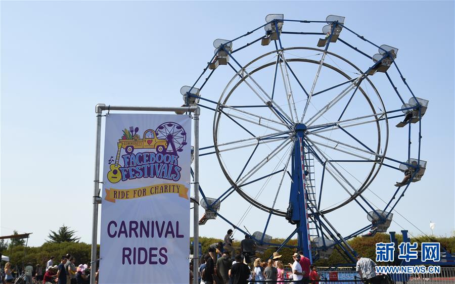 8月11日,在美国旧金山湾区,人们在“脸书节”游戏区乘坐摩天轮。当日,旧金山湾区脸书园区举行“脸书节”,人们在活动中欣赏文艺表演,品尝美食,乘坐游乐设施等,活动收入将捐给慈善团体。新华社记者吴晓凌摄
