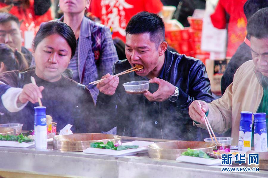 10月19日,食客们围坐在一口特大火锅前品尝。 当日,第十届中国(重庆)火锅美食文化节在重庆市江北区正式开幕。本届火锅美食文化节为期4天,以“麻辣happy城市节日”为主题,50000平方米的展区吸引了70余个火锅品牌、300余家火锅供应链企业参展,万人同烫火锅的盛况在“火锅之都”重庆再现。 新华社记者 刘潺 摄