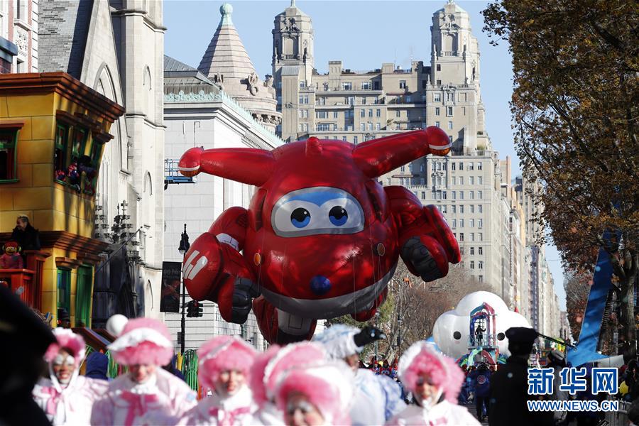 11月22日,在美国纽约感恩节大游行上,“超级飞侠乐迪”造型气球行进在曼哈顿街头。