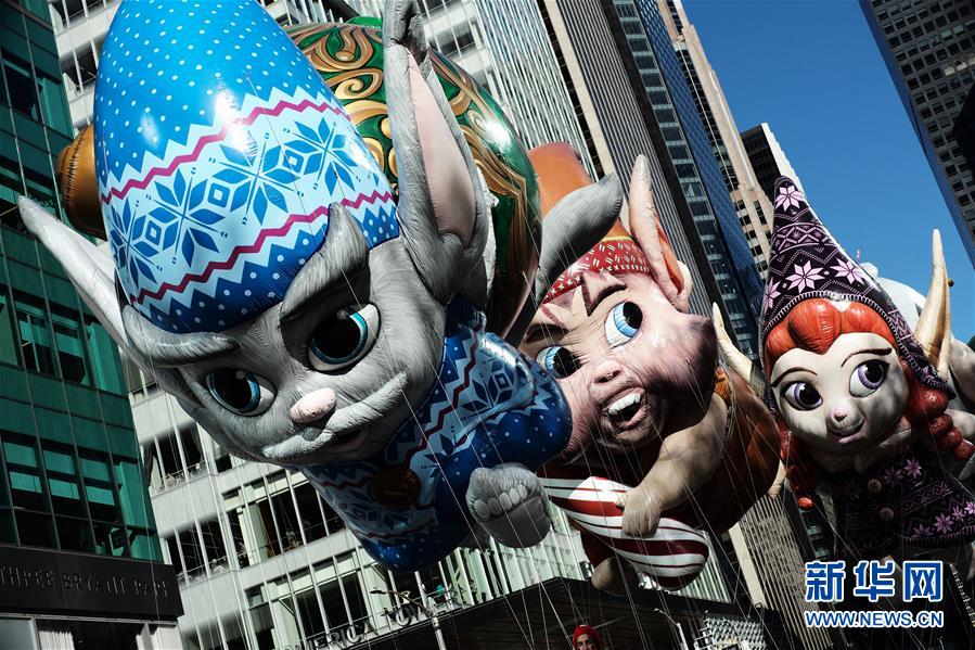 11月22日,在美国纽约感恩节大游行上,小精灵造型气球行进在曼哈顿街头。