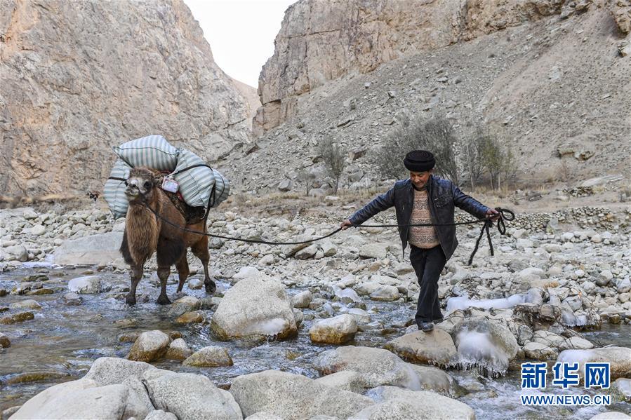 在去往阿克托尕栏杆村村委会的路上,都热·加尔曼牵着驮有行李的骆驼通过山间河流(11月17日摄)。新华社记者胡虎虎摄