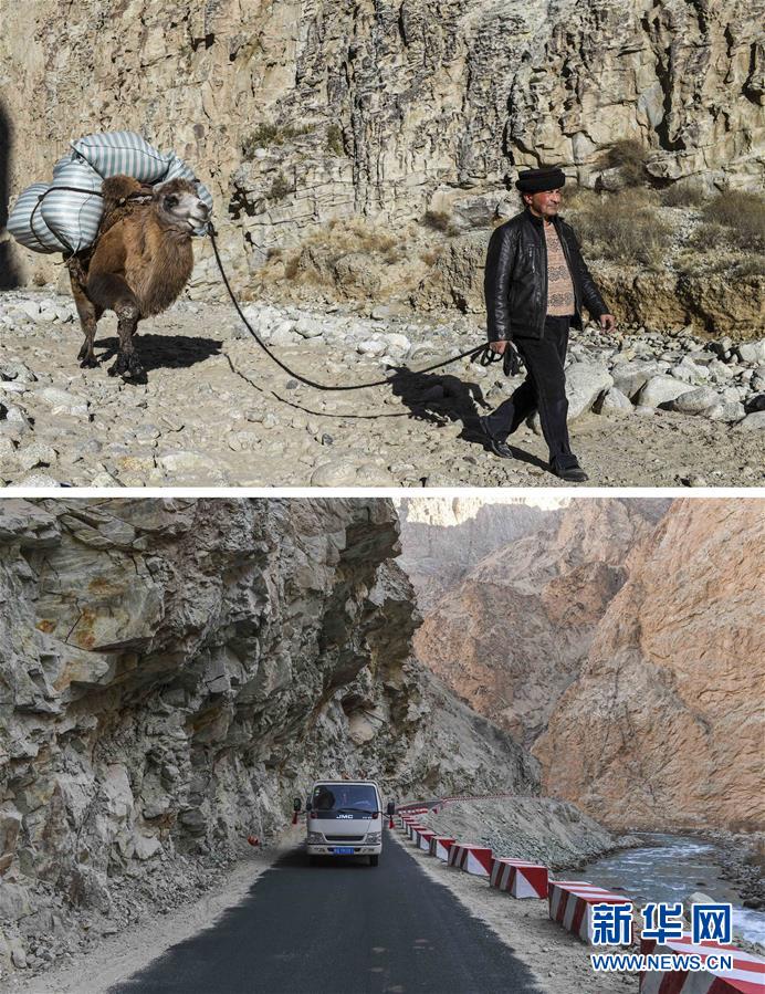 拼版照片:上图为都热·加尔曼牵着驮有行李的骆驼走在通往阿克托尕栏杆村村委会的路上;下图为都热·加尔曼乘坐汽车从大同乡前往塔提库力易地扶贫搬迁安置点(11月17日摄)。新华社记者胡虎虎摄