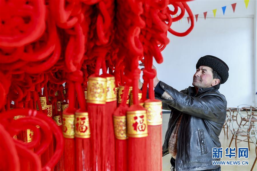 在塔什库尔干塔吉克自治县塔提库力易地扶贫搬迁安置点的卫星工厂,都热·加尔曼在参观由村民编制的手工艺品(11月18日摄)。新华社记者胡虎虎摄