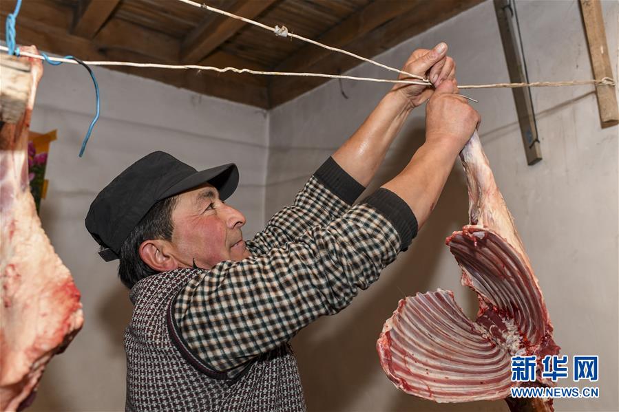 出发的前一天,都热·加尔曼把分割好的羊肉挂在家中,这是他特意为暂时留守在家中的妻子和老人准备的(11月16日摄)。新华社记者胡虎虎摄