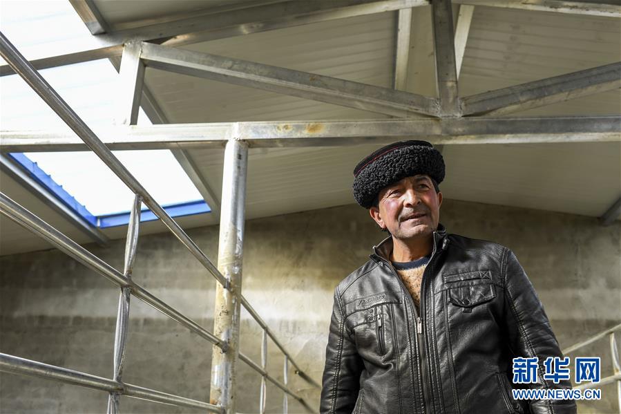 在塔什库尔干塔吉克自治县塔提库力易地扶贫搬迁安置点,都热·加尔曼在新修的标准化棚圈内参观(11月18日摄)。新华社记者胡虎虎摄