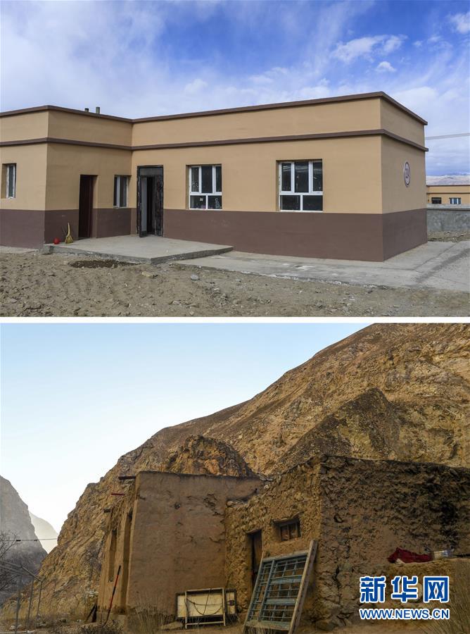 拼版照片:上图为都热·加尔曼在塔提库力易地扶贫搬迁安置点的80平方米的新房(11月18日摄);下图为都热·加尔曼在阿克托尕栏杆村一组的老房子外景(11月17日摄)。新华社记者胡虎虎摄