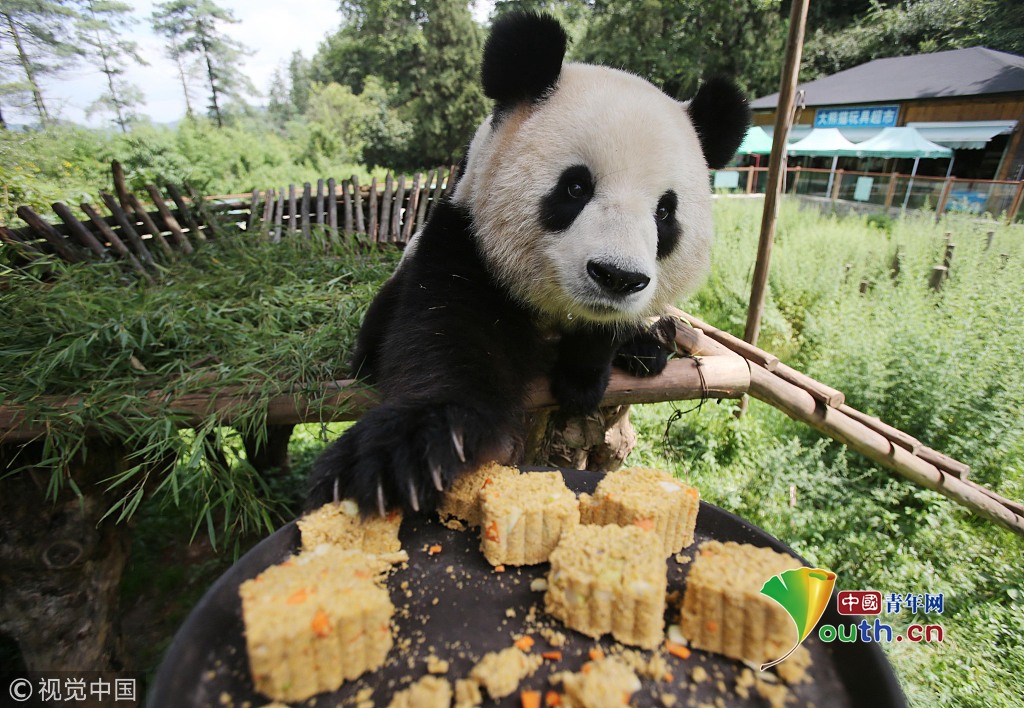 2014年9月4日,昆明,云南野生动物园,大熊猫思嘉吃专属胡萝卜月饼。