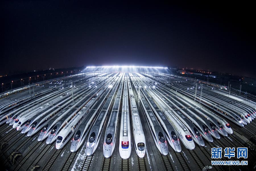 2018年2月1日凌晨,动车组停靠在武汉动车段的存车线上,准备进行检修和保温作业。近百组在武汉动车段经过检修、保温作业的动车组蓄势待发,迎接春运。新华社记者 肖艺九 摄