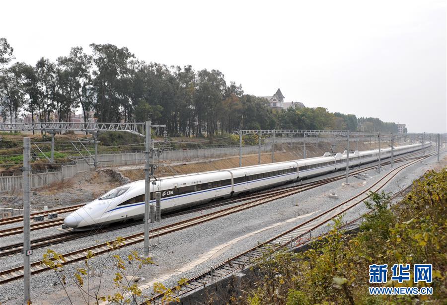 广西桂林至北京高铁列车在桂林市灵川县境内行驶(2013年12月28日摄)。 广西壮族自治区成立60年来,铁路建设发生翻天覆地的变化。来自中国铁路南宁局集团有限公司的数据显示,1958年广西铁路总里程为1346.3公里,如今广西铁路总里程达5191公里。广西与周边相邻省份间实现动车“公交化”开行。此外,北部湾港—重庆班列、东盟海产品冷链班列、“百色一号”果蔬专列等的开通和运营,强化了铁路供给的针对性和有效性。铁路成为助推广西经济社会快速发展的“大动脉”。 新华社记者陆波岸摄