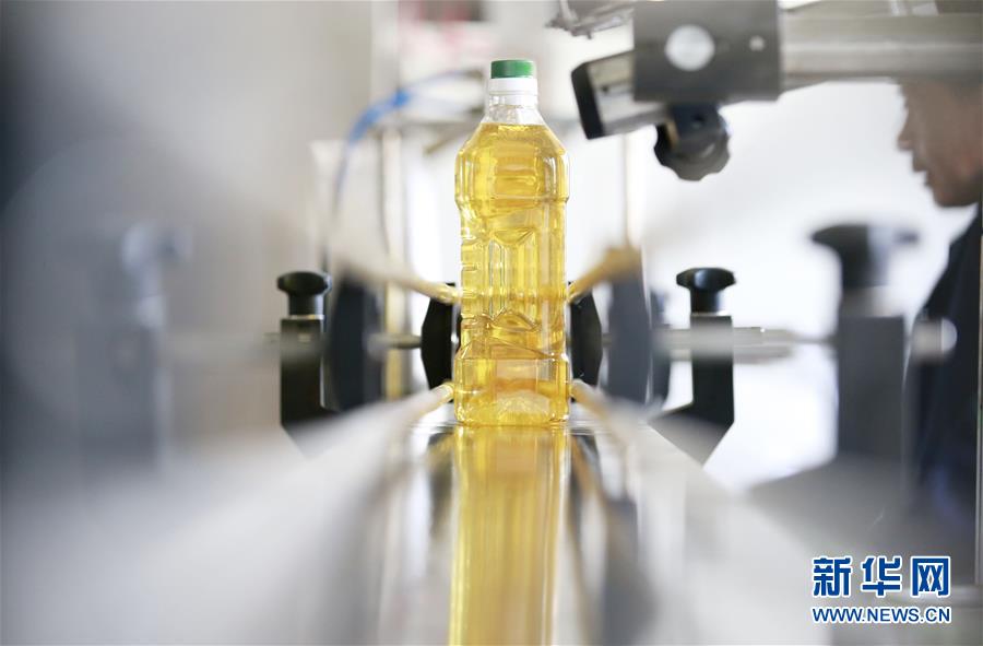 11月23日,在广西柳州三江侗族自治县一家生物科技公司,工作人员在茶油灌装生产线上忙碌。新华社记者任正来摄