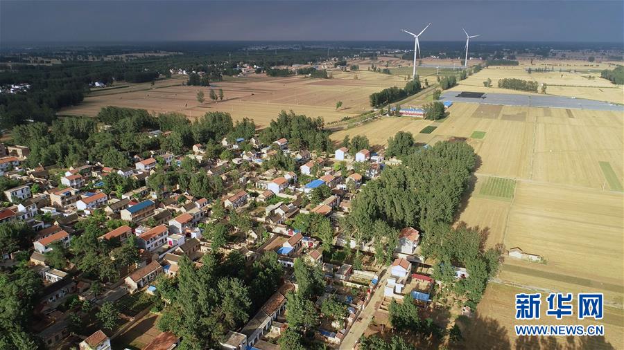 这是6月20日无人机拍摄的河南兰考县东坝头乡张庄村周围的麦田和风机。新华社记者冯大鹏摄