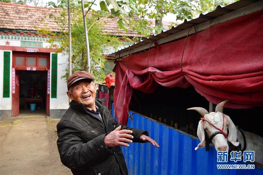 在河南兰考县葡萄架乡黄砦村,村民潘秀山站在自家羊圈旁(11月10日摄)。新华社记者冯大鹏摄