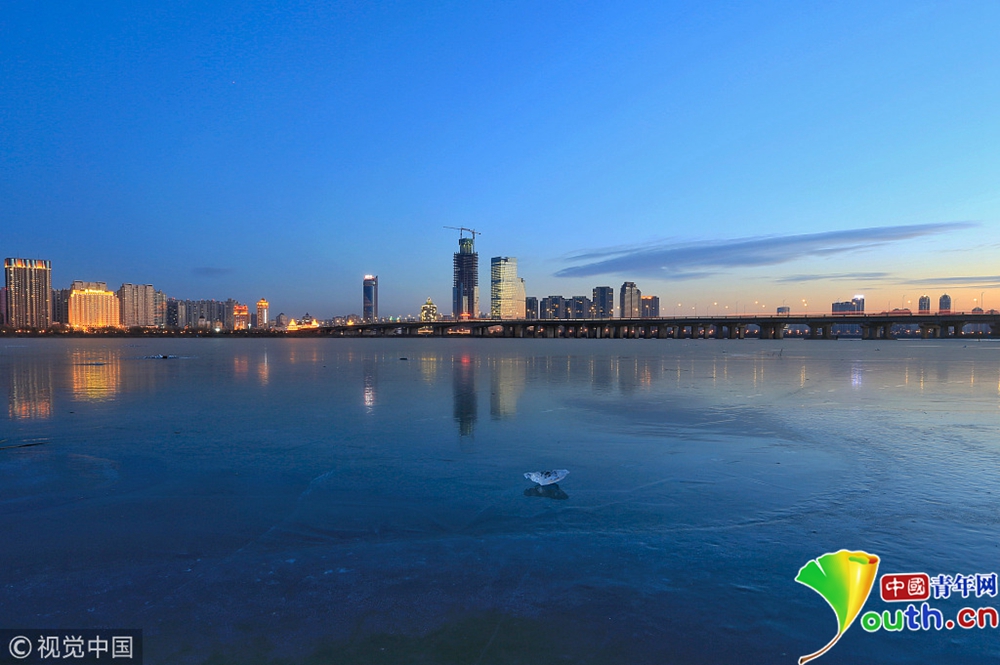 松花江封江 冰面如镜倒影冰城夜景