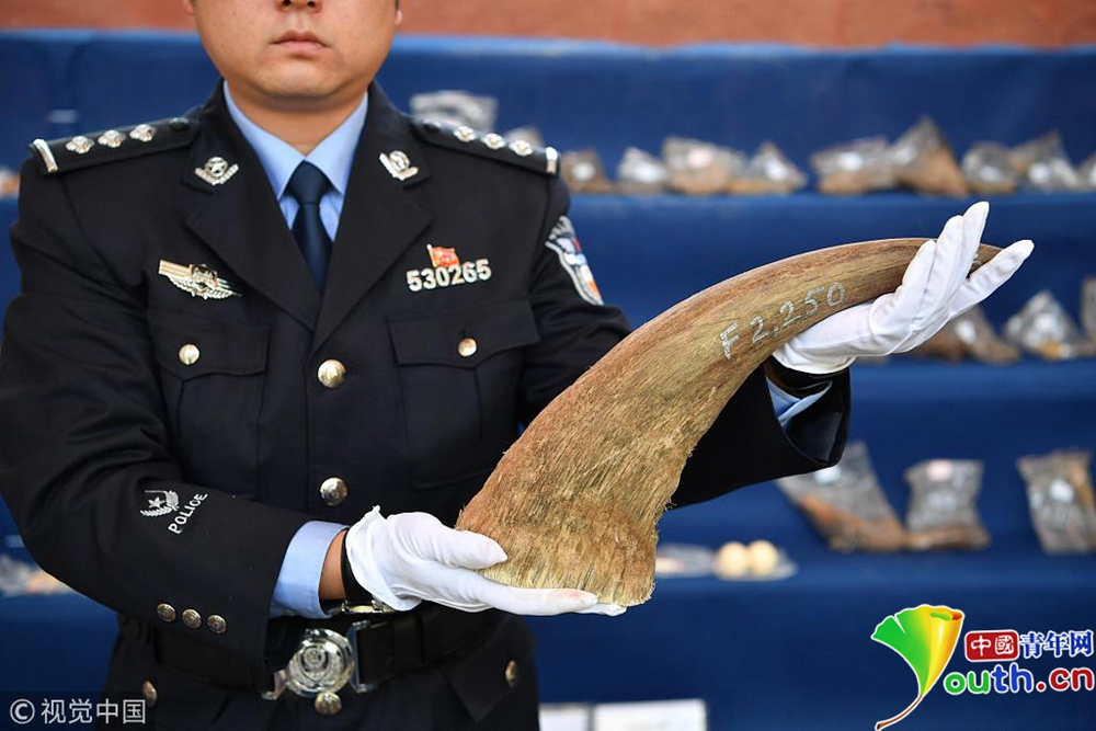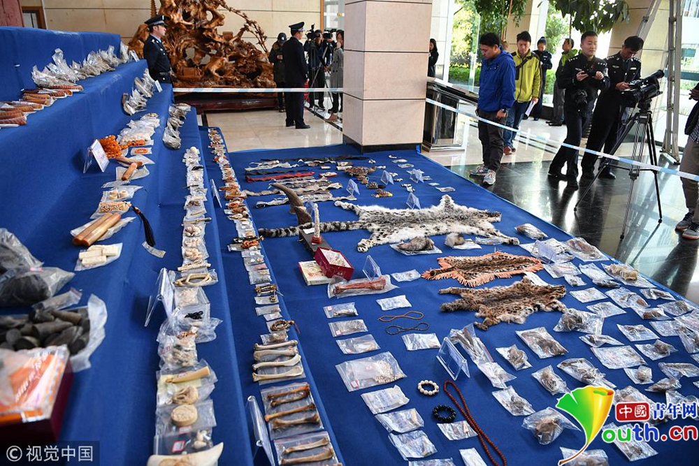 11月23日,现场展示警方查获的野生动物制品。当日,昆明市森林公安局向媒体通报,破获一系列特大非法收购出售珍贵濒危野生动物及其制品案件。