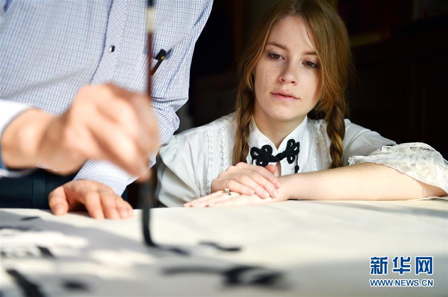11月24日,在石家庄桥西区家中,艾米莉跟公公学习中国书法。 新华社发(张晓峰 摄)