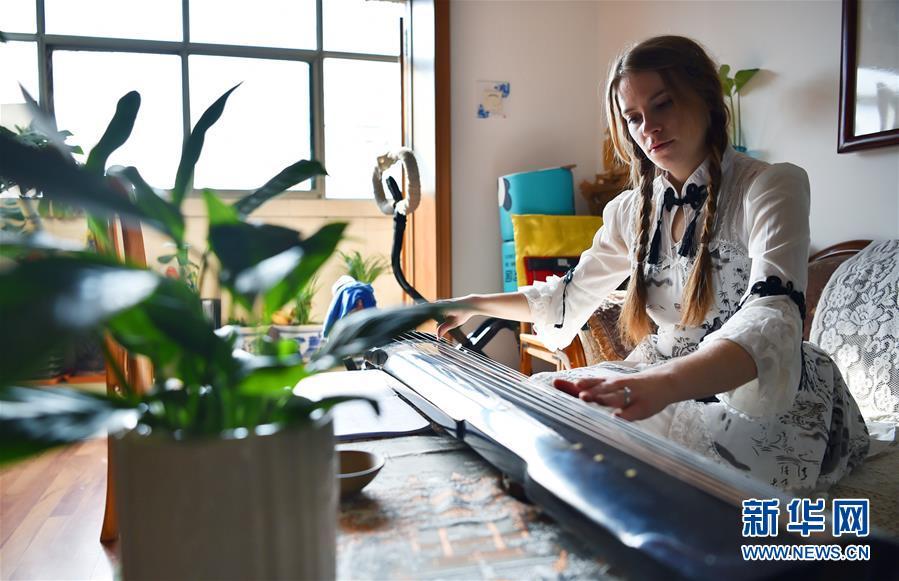 11月24日,在石家庄桥西区家中,艾米莉在练习弹古琴。 新华社发(张晓峰 摄)