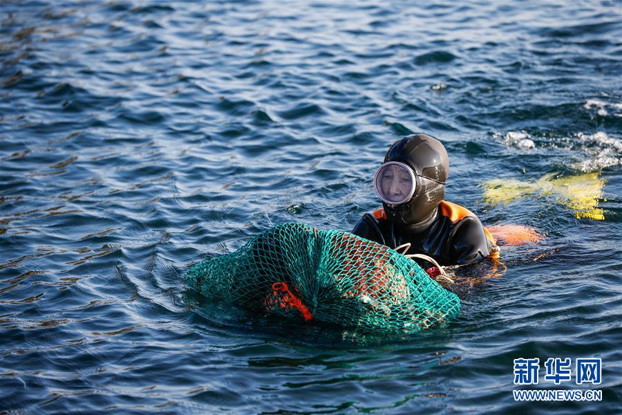 11月23日,一名海女在韩国济州岛的一处海岸附近作业。