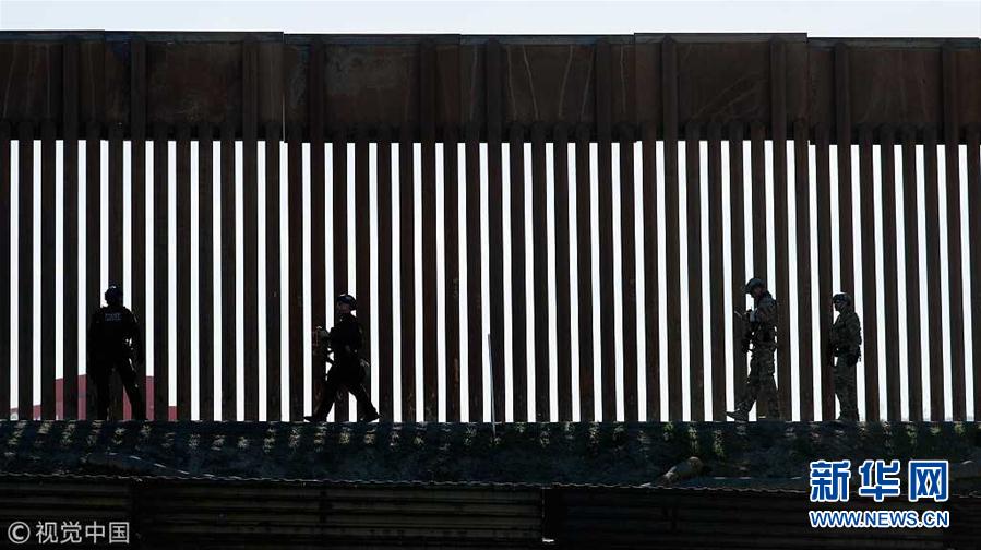 2018年11月25日,美国圣地亚哥,美国士兵在南部的圣思多罗过境处巡逻。当日,数百名中美洲移民试图冲破墨西哥提华纳与美国圣地亚哥间的一处口岸,进入美国申请庇护。美方封闭了此处入境口岸的双向道路和人行天桥。(图片来源:视觉中国)