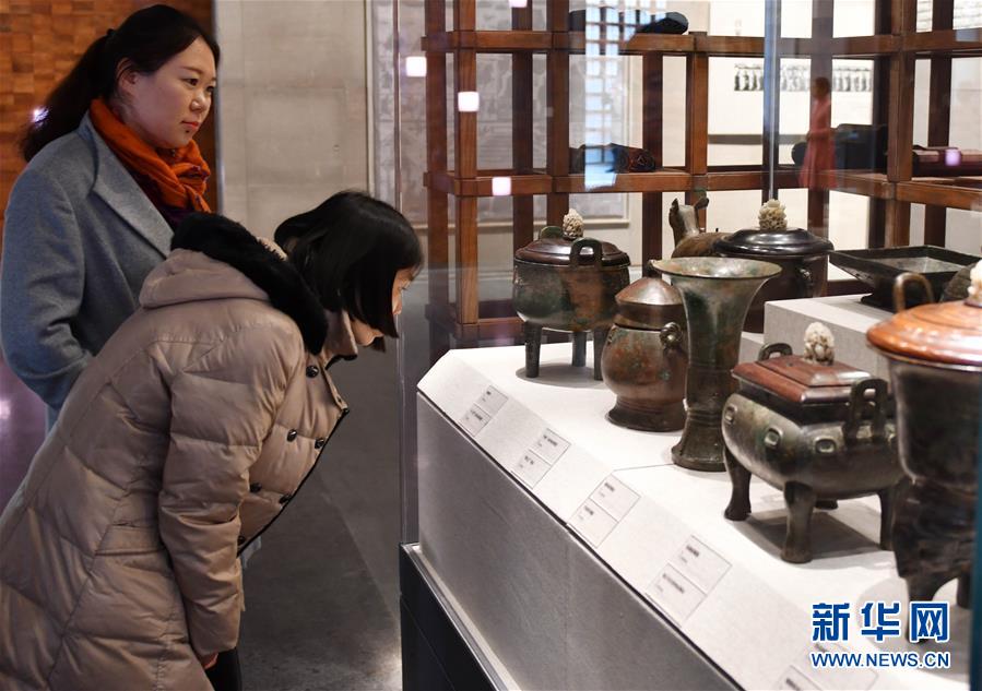 11月26日,参观者在观看孔子博物馆内的文物。 当日,耗时5年建成的孔子博物馆在孔子故里山东曲阜开馆试运行,首批2000多件文物搬出孔府文物档案馆,入住孔子博物馆,今后将有69万多件孔府文物逐批“乔迁新居”。 新华社记者 朱峥 摄