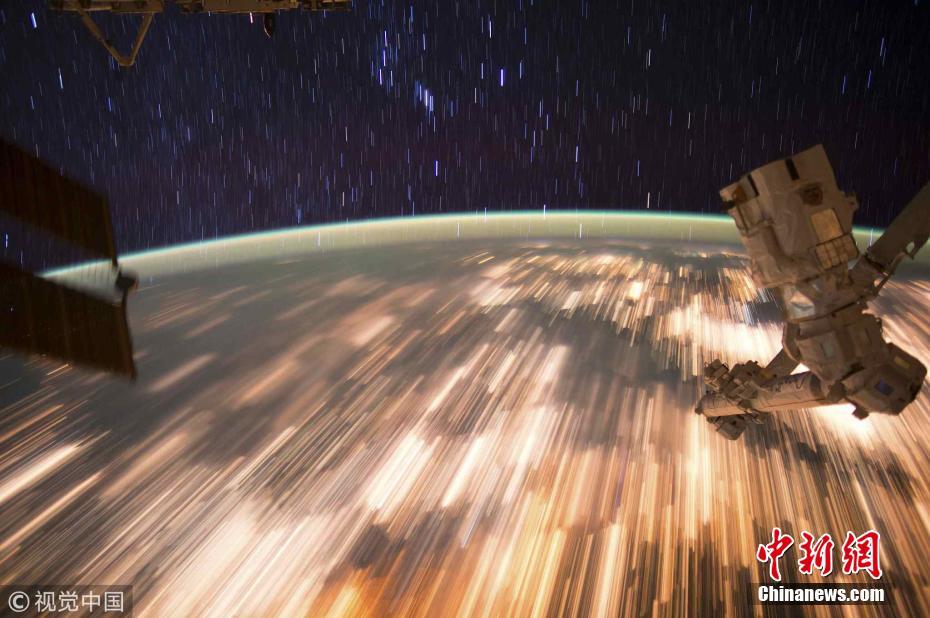 近日,国际空间站迎来了升空20周年纪念日。国际空间站的“乘客”们为地球留下许多美丽影像,南极到北极,从星空到大海,从白天到黑夜,这些数百千米高空拍摄的照片向我们展示了一幅幅震撼的“艺术作品”。图为2016年10月3日,NASA国际空间站宇航员利用长时间曝光拍摄的星迹和地球灯光图。图片来源:视觉中国