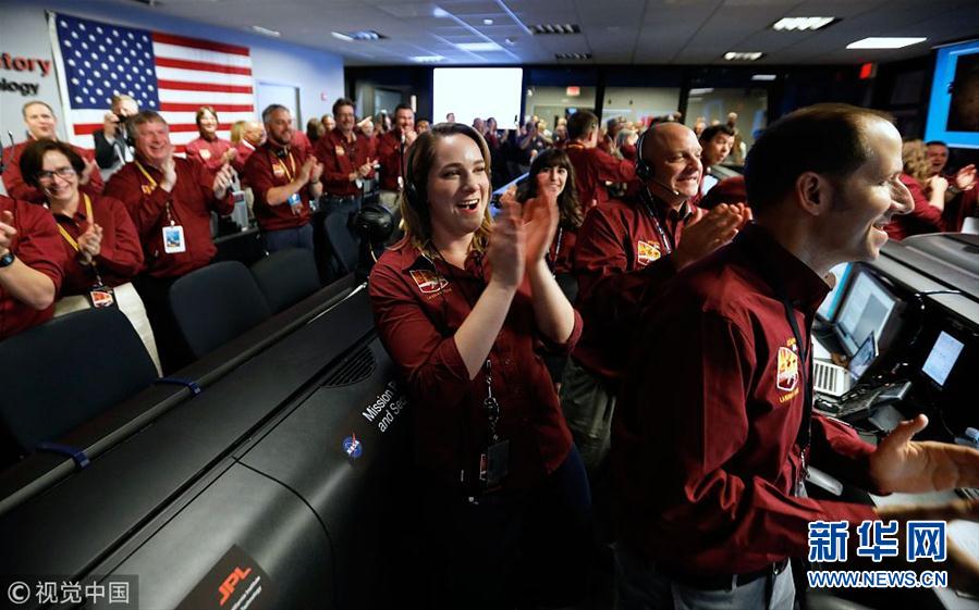当地时间2018年11月26日,美国加州帕萨迪纳市,美国宇航局工作人员在“洞察”号无人探测器成功着陆后欢呼雀跃。美国国家航空航天局(NASA)于今年5月初向火星发射的“洞察”号无人探测器于美国东部时间26日14时54分许(北京时间27日3时54分许)在火星成功着陆,执行人类首次探究火星“内心深处”奥秘的任务。随后,“洞察”号通过与其同行的迷你卫星于15时许传回了火星的第一张照片。 (图片来源:视觉中国)