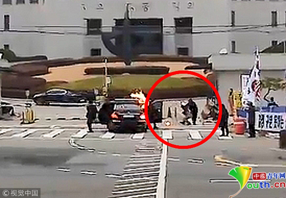 当地时间2018年11月27日,韩国首尔,27日上午9点10分,在首尔瑞草区的最高法院前面,一名74岁的示威男子向韩国最高法院院长金明秀所乘的车辆投掷燃烧瓶。副驾驶一侧的前轮和示威男子身上均起火,所幸被现场警察迅速扑灭,金明秀未受伤。当时,他正准备去上班。