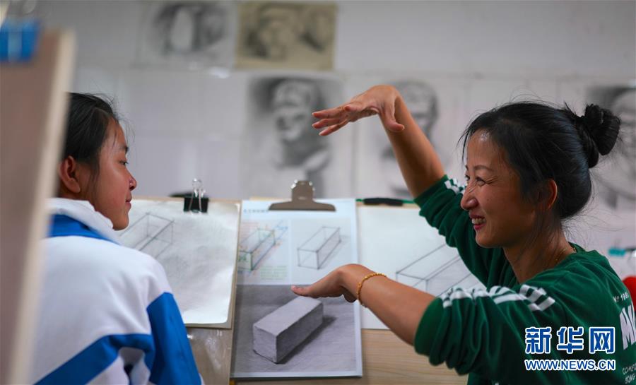 11月26日,曾文萍(右)在学校指导一名学生绘画创作。