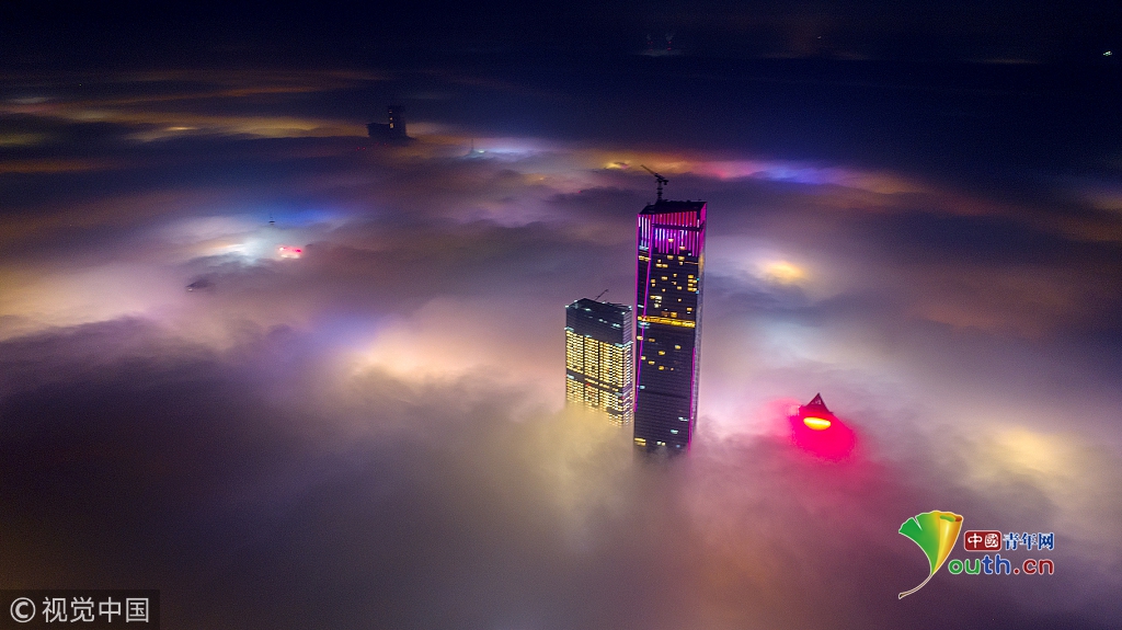 江苏镇江遭遇大雾天气 俯瞰城市夜景宛如七彩仙境