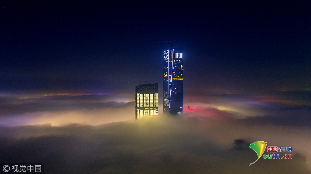 江苏镇江遭遇大雾天气 俯瞰城市夜景宛如七彩仙境