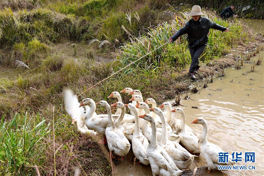 11月28日,在武夷山市岚谷乡后山村,肖流标在田间放养白鹅。新华社记者张国俊摄