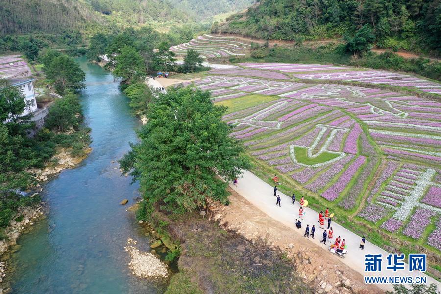 广西百色市德保县城关镇那温村的花海(11月27日无人机拍摄)。近日,广西百色市德保县城关镇那温村连片花海陆续盛开,吸引了众多游客。新华社记者 周华 摄