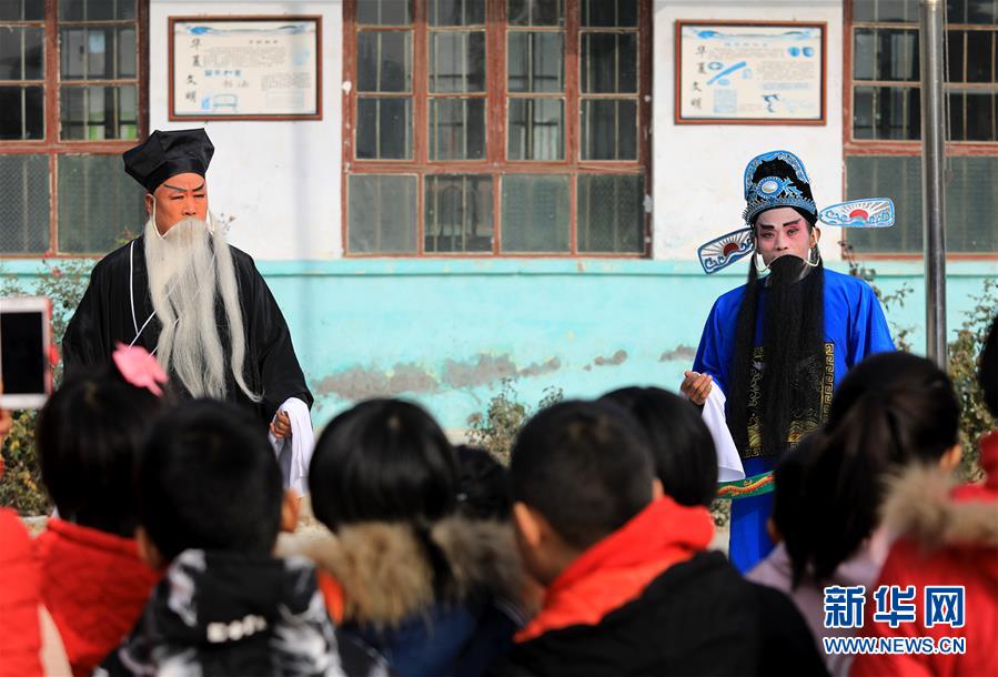 11月28日,在石家庄晋州市李家庄小学,“李家庄咳嗨腔”表演队队员正在表演。 新华社记者 赵丹惠 摄