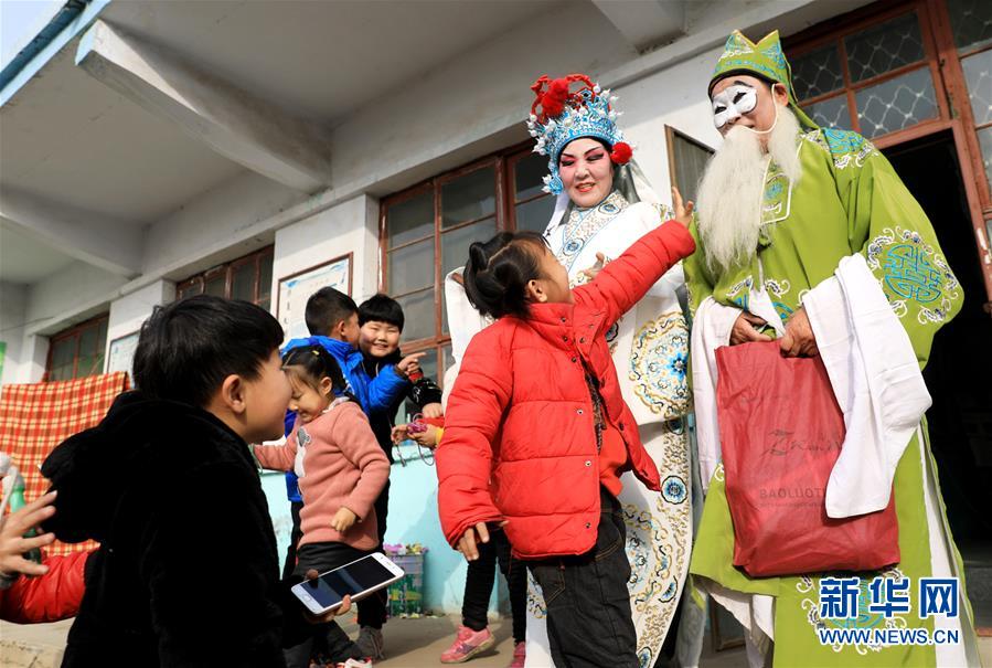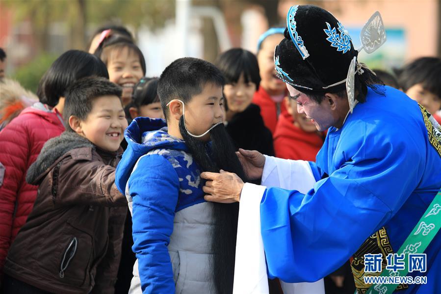 11月28日,在石家庄晋州市李家庄小学,“李家庄咳嗨腔”表演队队员与小朋友互动。 新华社记者 赵丹惠 摄