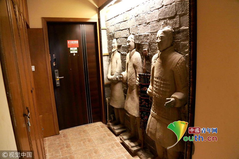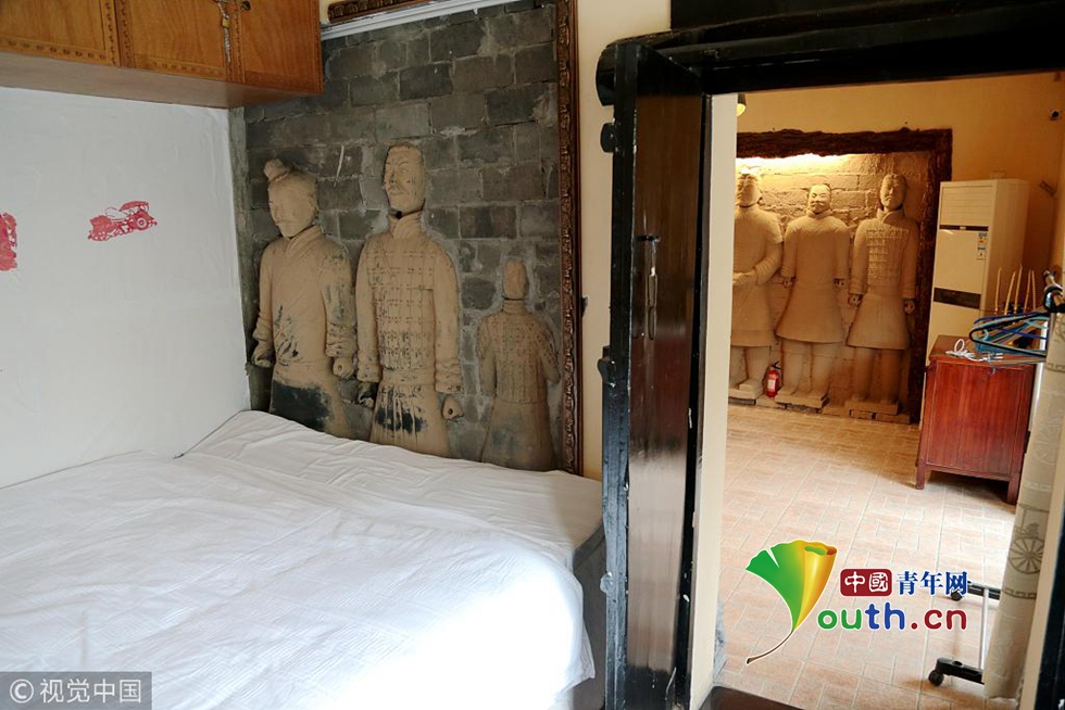 2018年11月27日,西安,民宿卧室内的“兵马俑”装饰。近日,西安一家主打“兵马俑”元素的民宿走红,“兵马俑”元素遍布在房间各个角落,“深情注视”着在此休憩的旅客,加上昏黄的灯光及复古的装饰,让不少旅客感叹如同居住在“秦始皇陵”。 张远(陕西分社)/视觉中国