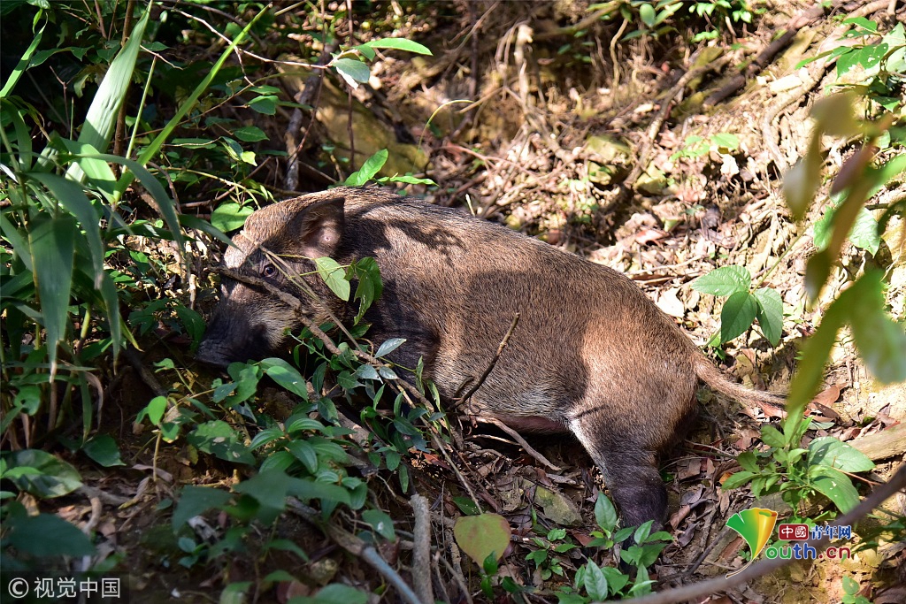 山猪个头不大,身长1米左右,毛色呈深褐色。从体型判断,这只山猪应该体重在35公斤左右,估计年龄只有1岁。