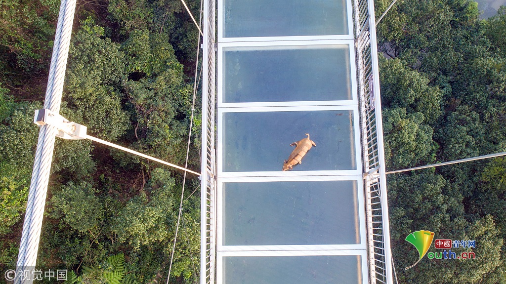 2018年11月29日,一只山猪误入广东清远古龙峡云天玻霸玻璃桥,结果被吓得趴在桥面上发抖,几名值班保安齐心协力将山猪从玻璃桥上解救出来,将其送回森林。
