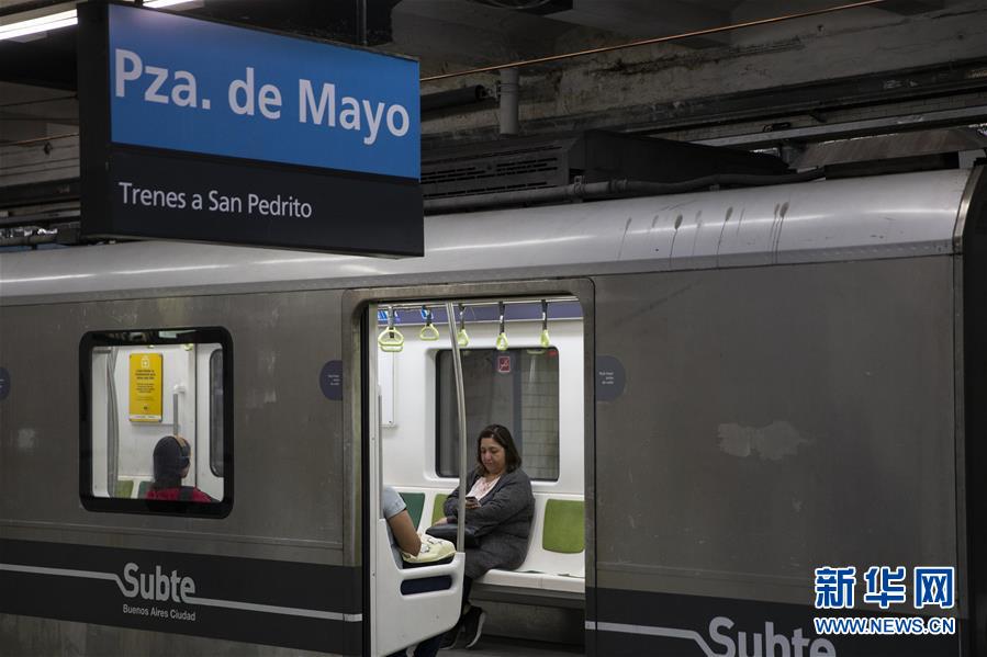 11月28日,在阿根廷布宜诺斯艾利斯地铁A线五月广场站,一名市民乘坐中国制造的地铁列车。