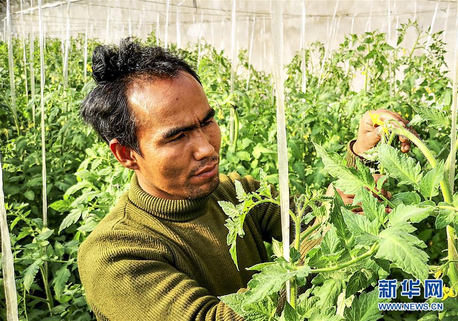 拜什托格拉克乡和融新村村民艾力·吾吉艾合麦提在大棚里查看番茄的生长情况(11月29日摄)。 新华社记者 白志强 摄