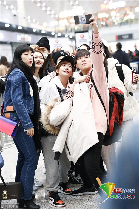 2018年12月3日,北京,“火箭少女101”全体成员现身机场前往国外录制团总综。其中孟美岐戴着墨镜,一身全黑运动装扮,大步流星气场超强,杨芸晴、yamy、杨超越等成员紧随其后,大家还一起在机场玩起自拍,好不欢乐。