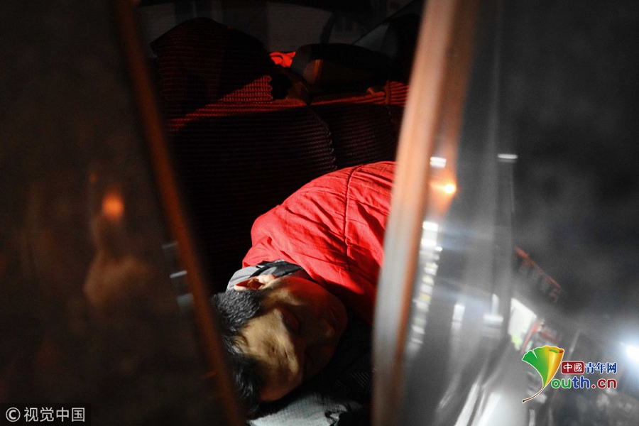 2018年11月17日,北京,由于医院只允许一名家长陪护,医院门口的日租房又很贵,袁东方不舍得花钱,只好借住在病友的车内。魏建顺/视觉中国