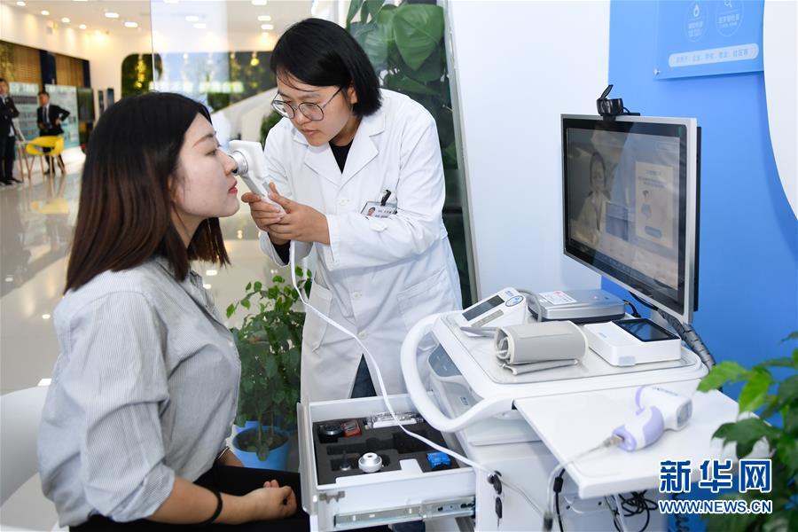 11月6日,参观者在乌镇互联网医院体验“智能医务室”的体检功能。据了解,“智能医务室”由智能移动医疗一体机、智能药柜以及一系列检查设备组成,根据健康档案和检查结果,视频连接家庭医生就能解决常见的医疗健康问题。  新华社记者黄宗治摄