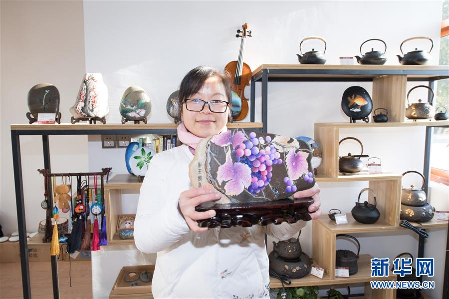 “农民画家”陈苏兰在开设的工作室内展示创作的石头画《下姜葡萄》(1月10日摄)。