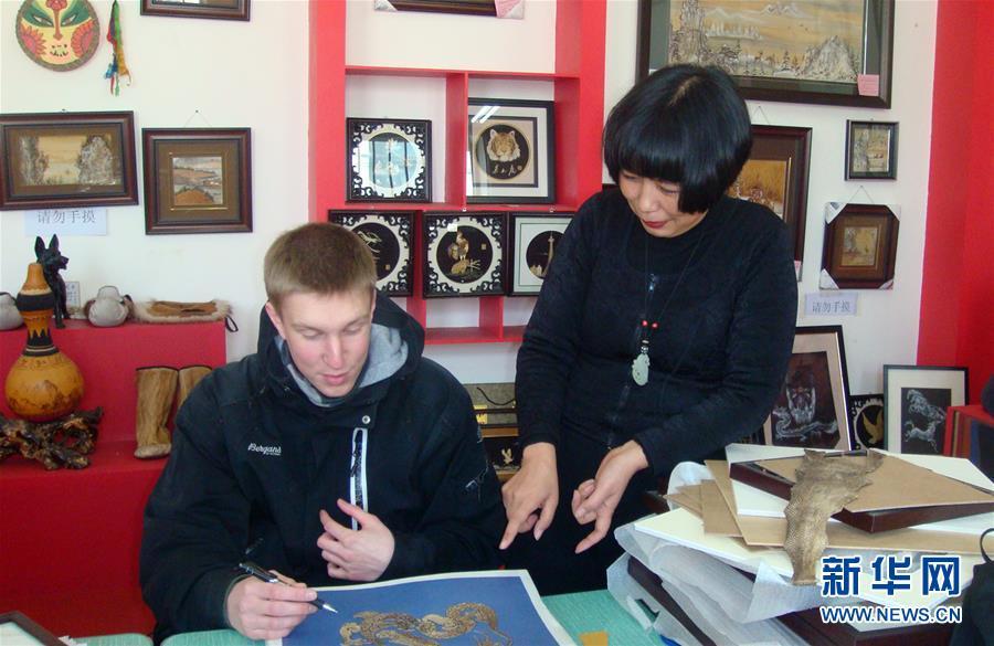 张琳在位于哈尔滨的工作室指导前来参观学习的外国学生制作鱼皮画(2011年3月20日摄)。国家级非物质文化遗产赫哲族鱼皮制作技艺是我国赫哲族传统手工艺术。作为这项技艺的黑龙江省级传承人,十余年来,张琳一直从事鱼皮画的研究和创作,并通过做推广、开讲座、办活动,让更多年轻人了解并喜欢上这一传统手工艺,将这项濒临失传的艺术更好地传承下去。新华社发